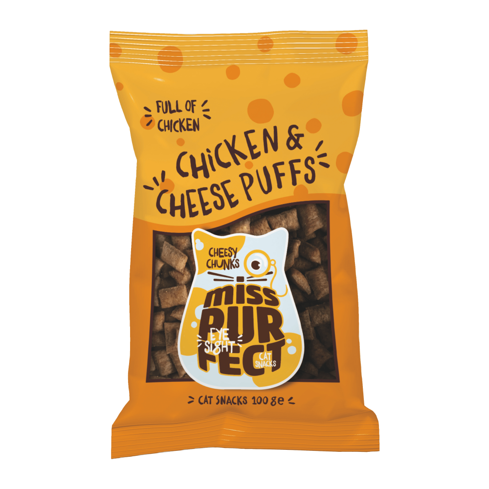 Miss Purfect Chicken & Cheese Puffs to wyjątkowa przekąska, która łączy pyszny kurczak z kremowym serem. Każda 100 g paczka zawiera małe poduszeczki, które Twój kot pokocha za smak i aromat.