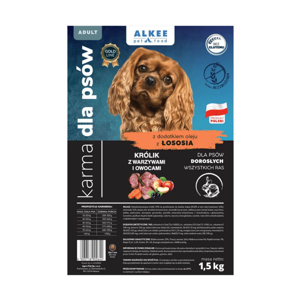 Karma ALKEE Królik z Warzywami i Owocami to pełnoporcjowa, naturalna karma klasy premium przeznaczona dla dorosłych psów wszystkich ras. Jej wyjątkowa receptura opiera się na dehydratyzowanym mięsie królika (39%), będącym źródłem lekkostrawnego i hipoalergicznego białka. Dzięki dodatkowi oleju łososiowego (10%) karma wspiera zdrową skórę, błyszczącą sierść oraz prawidłowe funkcjonowanie serca i układu odpornościowego.