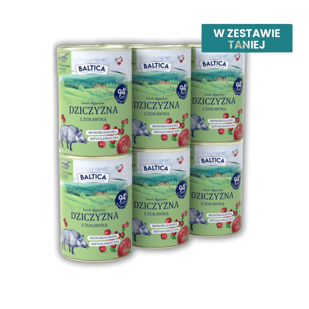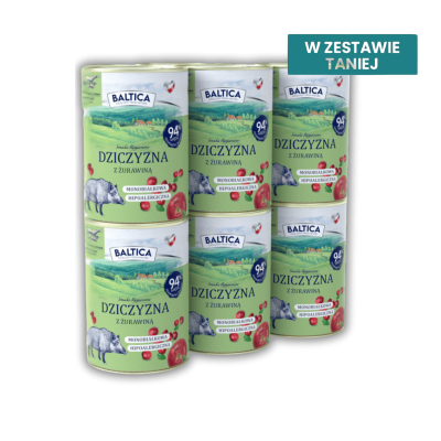 Skład: 68% dziczyzna (68% mięso z dzika), 26% bulion z dziczyzny, 4% żurawina, 1% jabłko, 1% minerały.