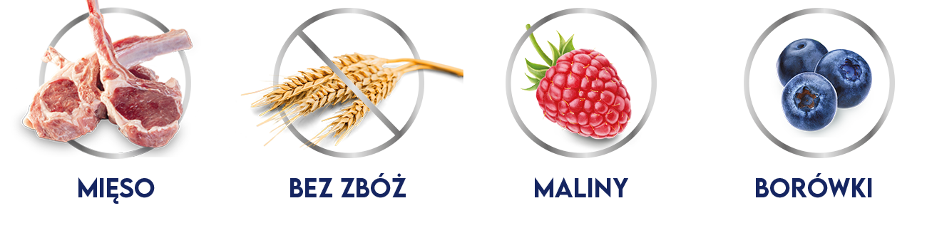 Skład: 68% jagnięcina (27% mięso, 14% żołądki, 12% płuca, 10% przełyki, 5% wątroba), 26% bulion jagnięcy, 4% maliny, 1% jagody, 1% minerały.