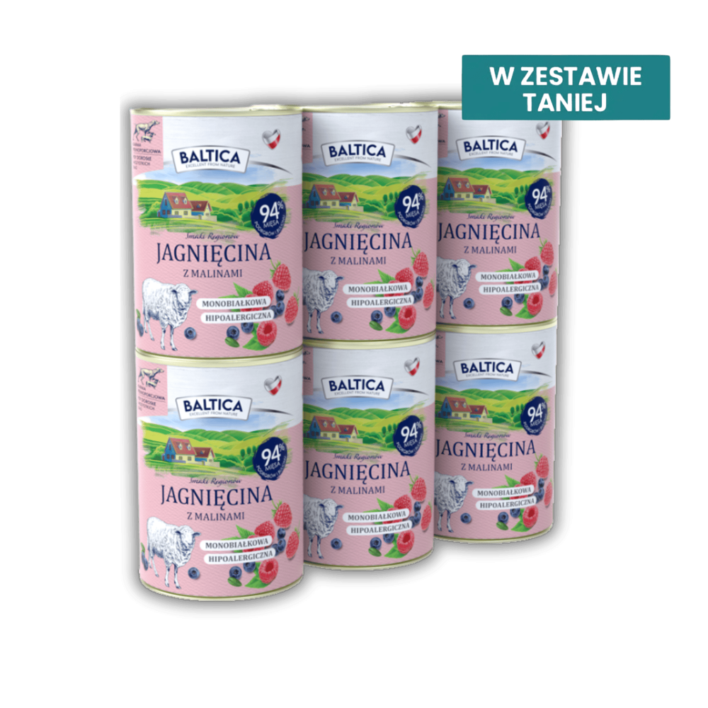 Skład: 68% jagnięcina (27% mięso, 14% żołądki, 12% płuca, 10% przełyki, 5% wątroba), 26% bulion jagnięcy, 4% maliny, 1% jagody, 1% minerały.