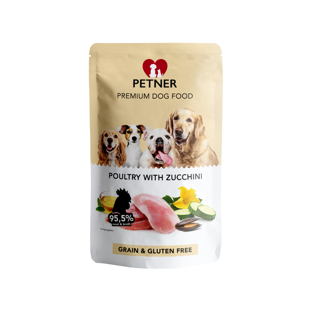 Zadbaj o zdrowie swojego pupila z pełnoporcjową karmą Petner z drobiem i cukinią, która oferuje idealne połączenie wysokiej smakowitości i wartości odżywczych. Aż 95,5% saszetki stanowi mięso drobiowe oraz podroby – serca, mięso, wątroba, żołądki i szyje – zanurzone w aromatycznym bulionie własnym.