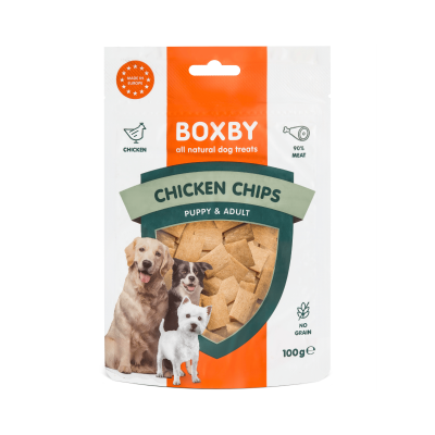 Boxby Chicken Chips 100g to naturalne, wysokobiałkowe przysmaki dla psów, wykonane w 90% z czystego mięsa kurczaka. Dzięki swojej bezzbożowej recepturze, bez dodatku cukru i sztucznych aromatów, są doskonałym wyborem dla psów z wrażliwym układem pokarmowym lub skłonnościami do alergii.