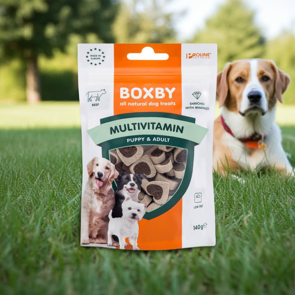 Boxby Multivitamin 140g to funkcjonalne przysmaki treningowe stworzone z myślą o wspieraniu zdrowia Twojego psa. Zawierają wołowinę oraz są wzbogacone kompleksem witamin i minerałów, wspomagając ogólną kondycję organizmu.