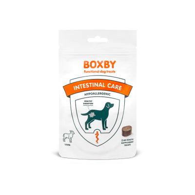 Boxby Functional Treats Intestinal Care 100g to funkcjonalny przysmak dla psów, opracowany z myślą o wsparciu zdrowia układu pokarmowego. Zawiera jedno źródło białka – 26% mięsa z jagnięciny – oraz składniki wspomagające trawienie, takie jak prebiotyki FOS i inulina. Dodatkowo wzbogacony o lekkostrawny ryż i energetyczny tłuszcz kokosowy.