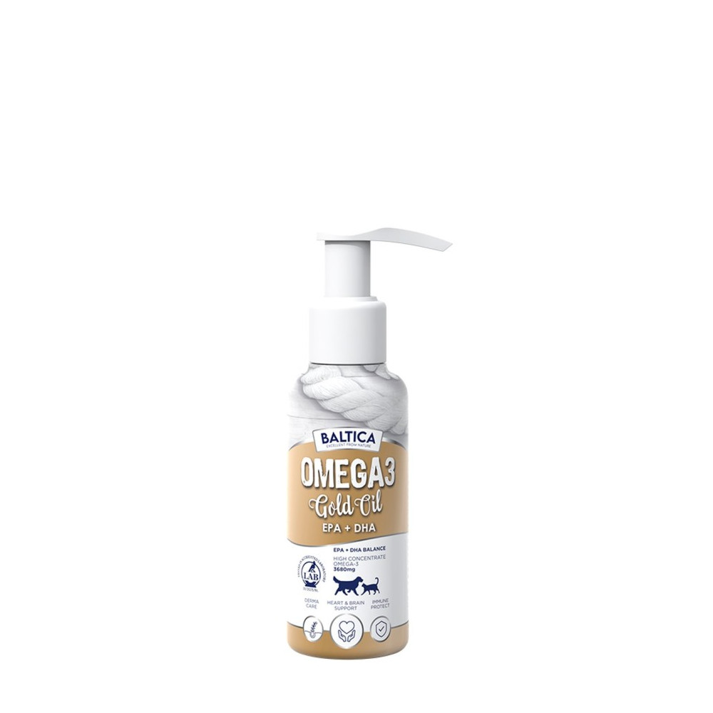 Baltica Gold Oil Omega-3 to wysokiej jakości suplement diety w formie oleju, pozyskiwany z dzikich ryb morskich. Zawiera skoncentrowane kwasy tłuszczowe Omega-3 (EPA i DHA), które wspierają prawidłowe funkcjonowanie układu nerwowego, sercowo-naczyniowego oraz wspomagają kondycję skóry i sierści u psów i kotów.