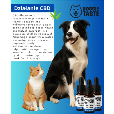 DoggieTaste to łagodny olejek konopny przeznaczony dla małych psów i ras miniaturowych. Zawiera 5% CBD i 1% CBG – proporcje dostosowane do mniejszej masy ciała i bardziej wrażliwego układu nerwowego. Idealny jako codzienne wsparcie zdrowotne oraz przy lekkich dolegliwościach.