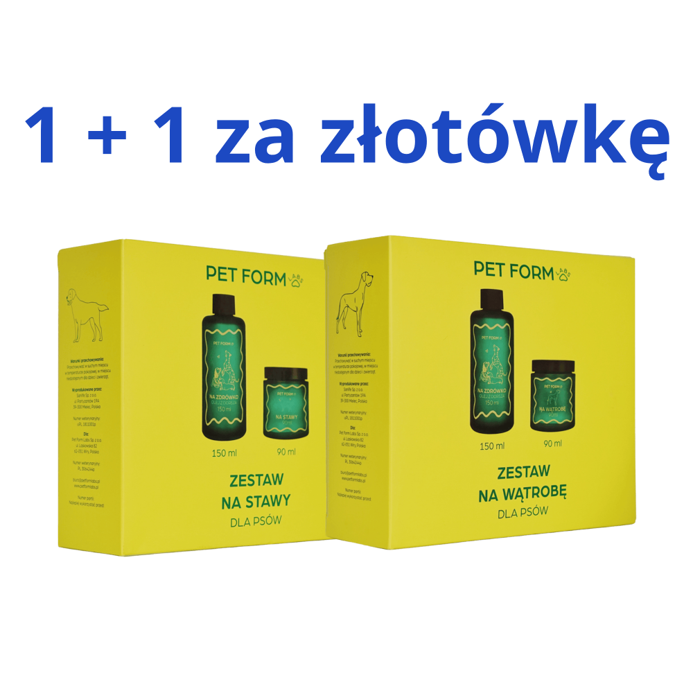 Połączenie tych dwóch zestawów to wyjątkowa propozycja dla psów, które wymagają wsparcia zarówno w obszarze funkcjonowania wątroby, jak i układu kostno-stawowego.
