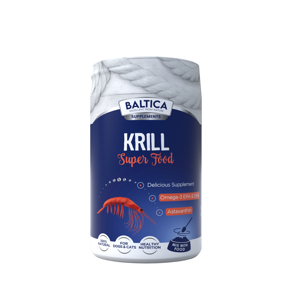 Baltica Kryl to naturalny suplement diety w formie mączki, przeznaczony dla psów i kotów jako codzienne uzupełnienie karmy w wysokiej jakości białko, kwasy tłuszczowe oraz naturalne antyoksydanty. Produkt zawiera 100% czystej mączki z kryla antarktycznego (Euphausia superba), pozbawionego egzoszkieletu, co wpływa na jego lepszą strawność i biodostępność składników odżywczych.