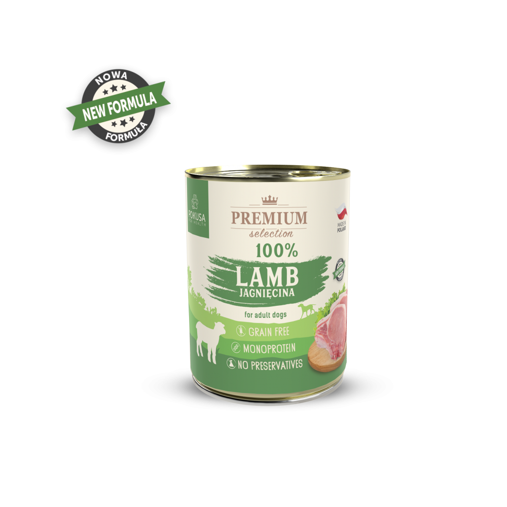 Pokusa Premium Selection 100% jagnięciny to mokra karma uzupełniająca dla psa z soczystego mięsa jagnięcego: